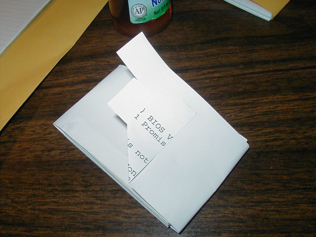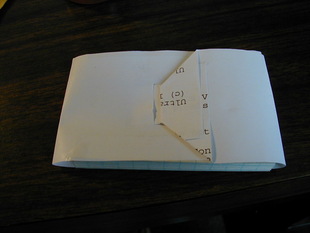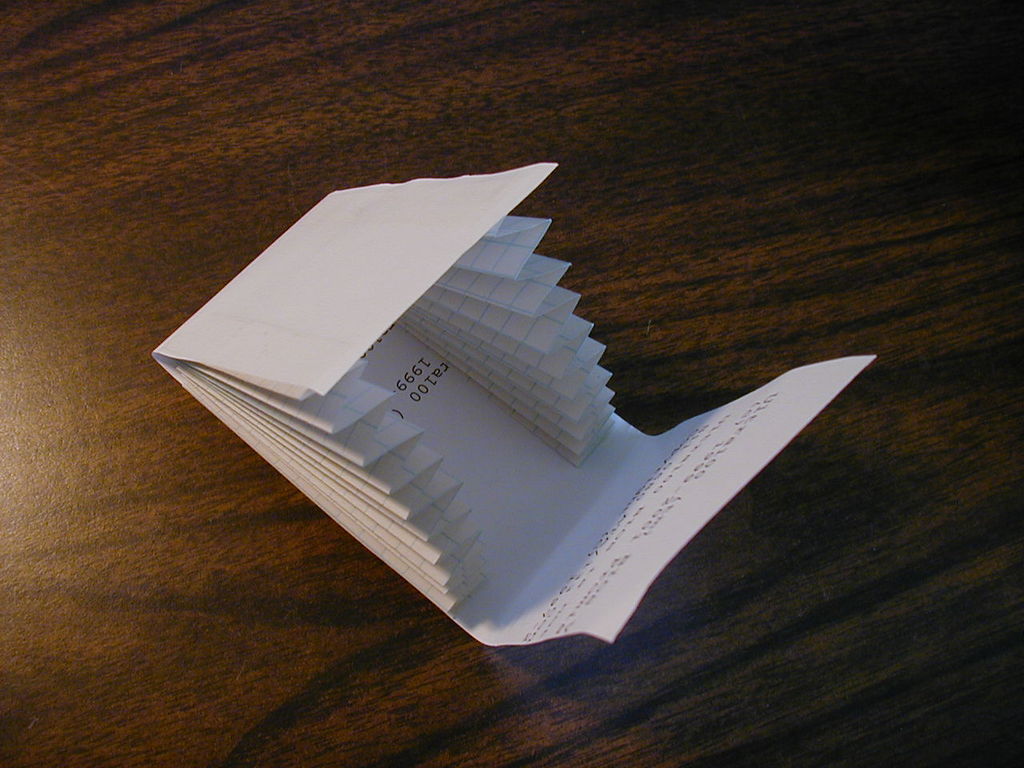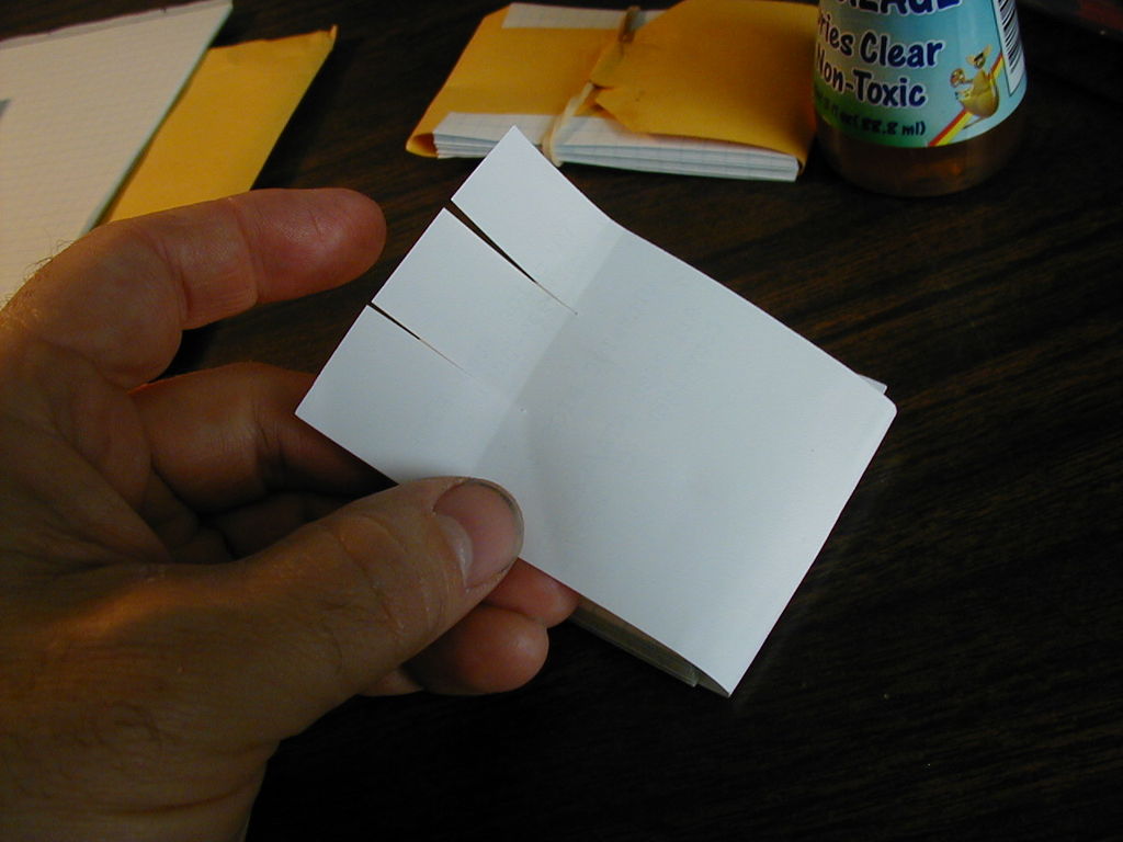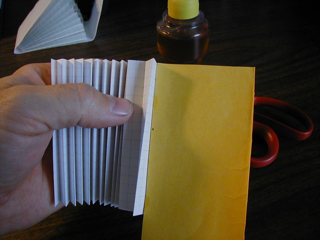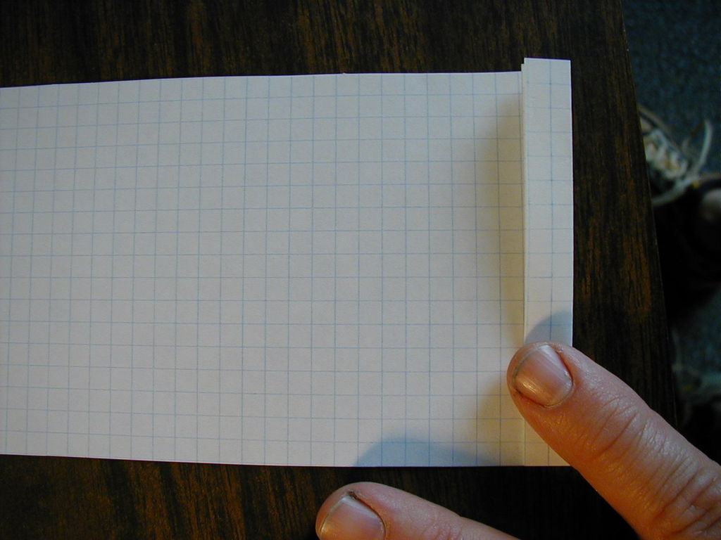 剪下一块8.5 x 11英寸方格纸朗维分为两条,每个仅比名片窄很长。注意:该卡的长度,决定了宽度为11英寸的方格纸条。他们可以稍微窄比的长度名片---会有一点点额外的房间将被绑定在该基地的方式,因为钱包。沿图线折叠式的作品,每两行---这是方便使用方格纸的副产品:内置导游。这会给你一个0.5英寸深的折叠式(方格纸0.25英寸)或0.4英寸深折叠(0.2英寸方格纸)。这可能是浅的,只要你想使折痕。在一个11英寸的一张方格纸,你会得到10“车厢”,采用0.25英寸的纸张,和13“车厢”,采用0.2英寸的纸张,保持良好的卡。