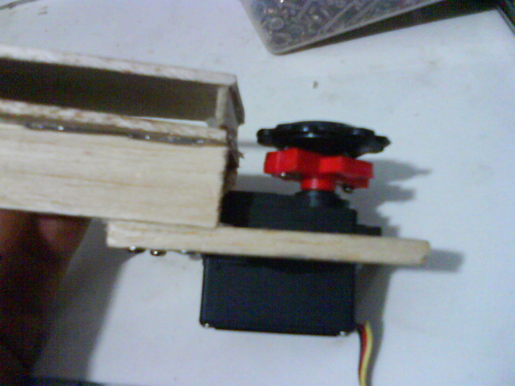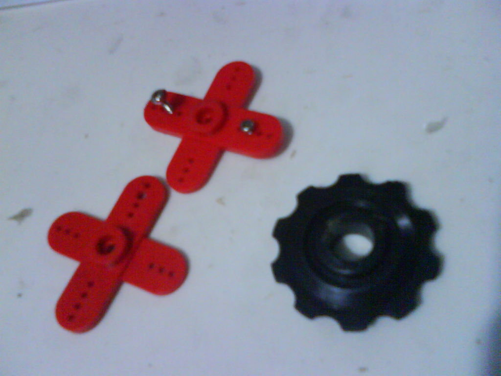 在转动伺服连续旋转,焊两根电线直接接触的发动机,通过电子电路。我用导线本身的伺服,照顾三线最初的联系,以后还可以再次使用伺服给小费。上述工作完成后,只需重新组装伺服。如何把伺服连续旋转一个很好的教程:http:// http://arduinianos.blogspot.com/的结合两个十字架作为数字使用螺丝或胶粘紧。十字架被选中是因为他们有一个中心,适合市长,让仆人和齿轮之间的最佳路线。