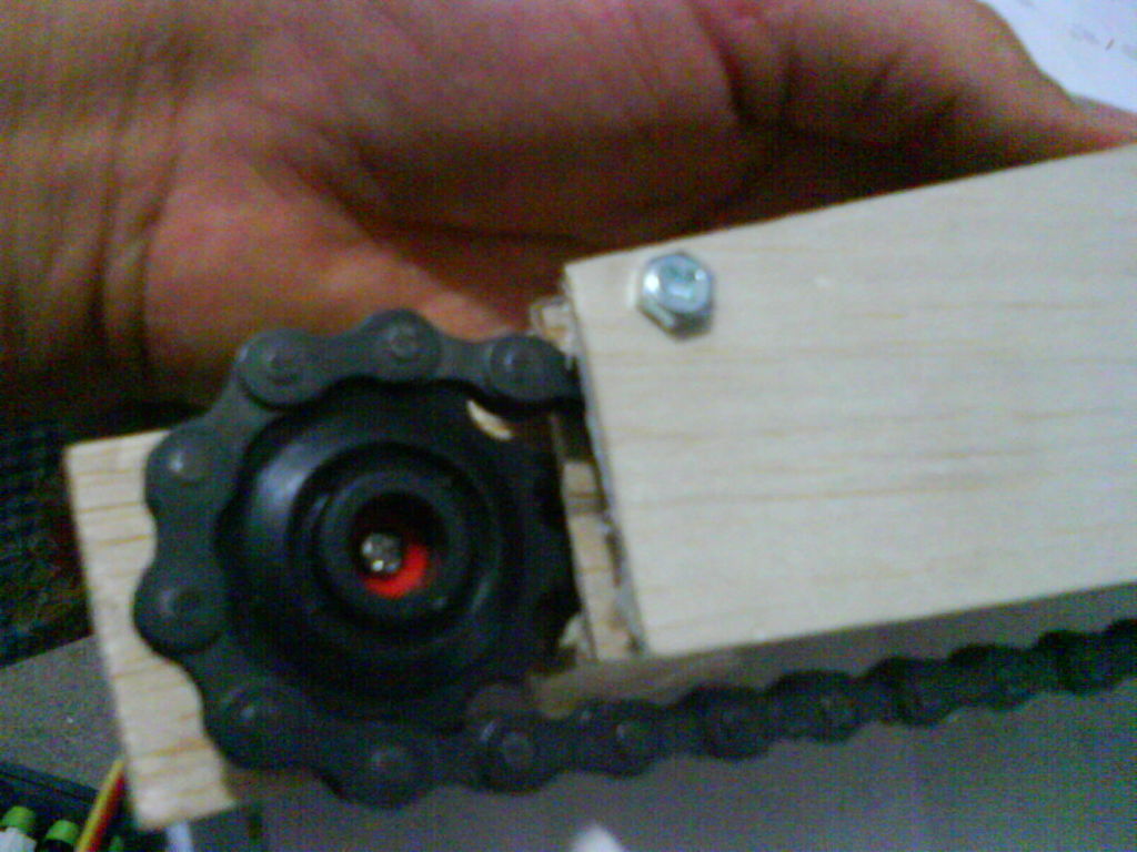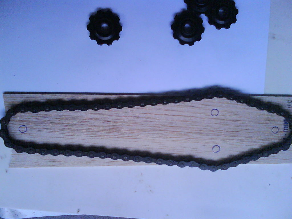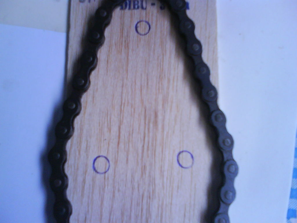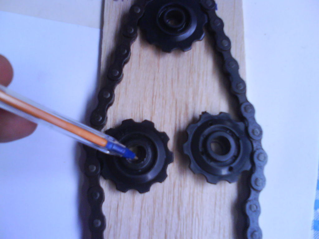看到的是一块旧自行车链条(约75厘米),但将是非常沉重。起初,我把带钢上链,并试图寻找最佳位置的齿轮。之后,我用钻头孔,安装和固定齿轮。我把链和标记用钢笔,这样,当她被拉长,它应尽可能地在身体周围的钢带。经过这些调整后,我做了一个模板,以方便。我做了一个仆人的投放量,并用同样的方法试验和错误的山体伸进。结果发现,环比还是有点松。因此,我用两个螺丝的金属圆筒,一点点拉长产业链。结果是很不错的。注意:该金属圆筒必须仅由螺杆支撑,即,它必须运行,以便通过流。