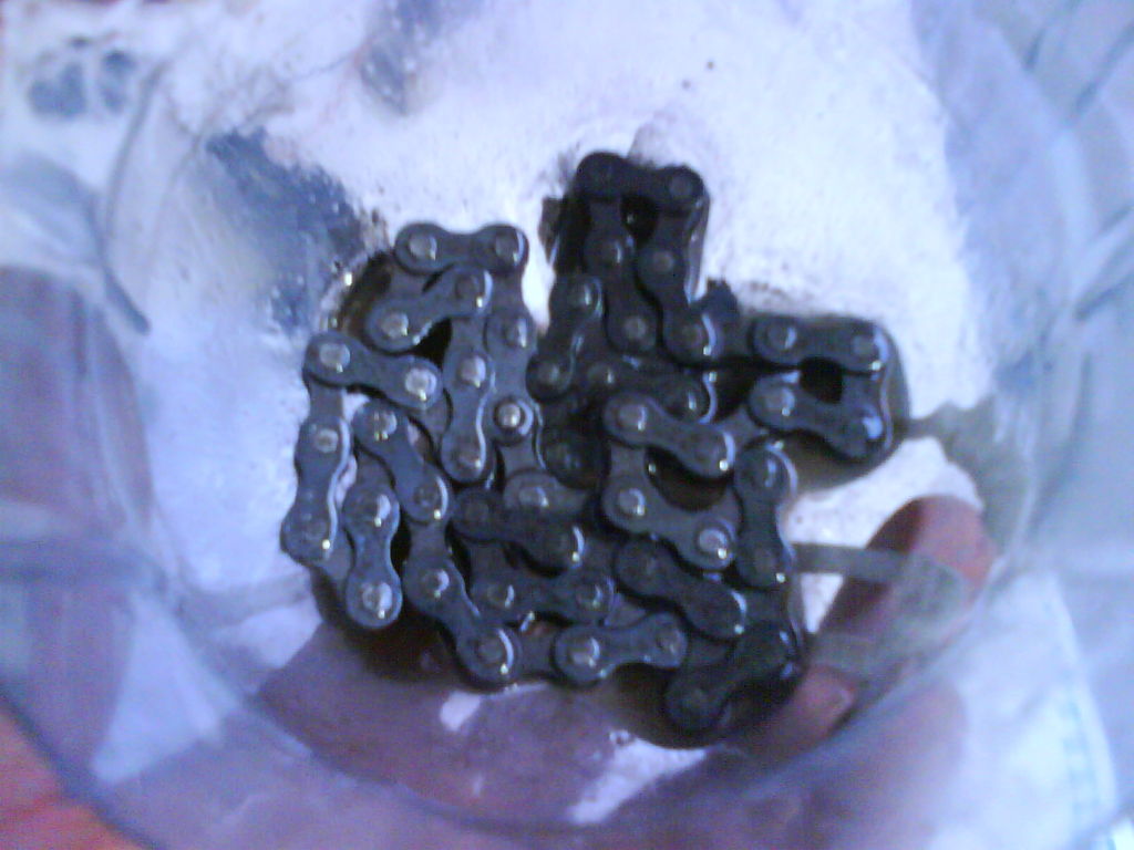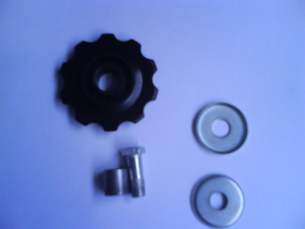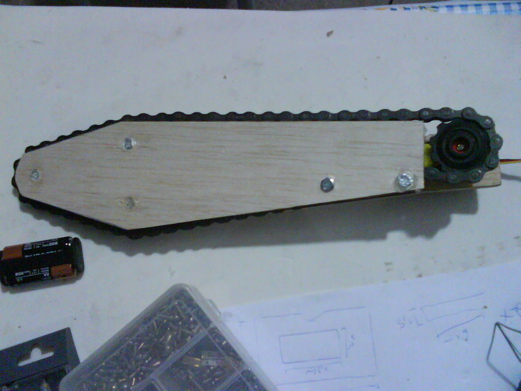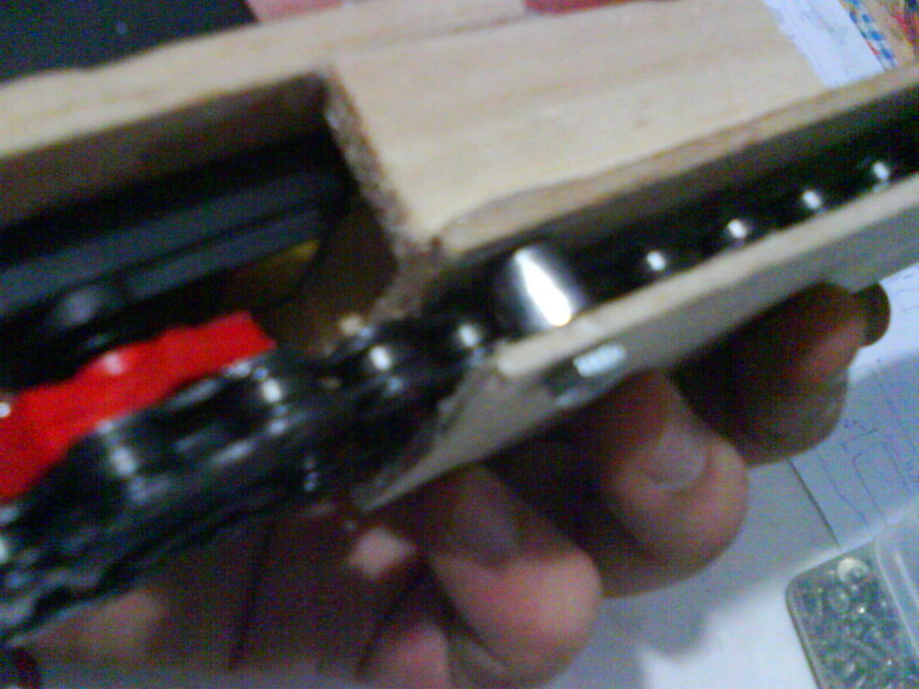 看到的是一块旧自行车链条(约75厘米),但将是非常沉重。起初,我把带钢上链,并试图寻找最佳位置的齿轮。之后,我用钻头孔,安装和固定齿轮。我把链和标记用钢笔,这样,当她被拉长,它应尽可能地在身体周围的钢带。经过这些调整后,我做了一个模板,以方便。我做了一个仆人的投放量,并用同样的方法试验和错误的山体伸进。结果发现,环比还是有点松。因此,我用两个螺丝的金属圆筒,一点点拉长产业链。结果是很不错的。注意:该金属圆筒必须仅由螺杆支撑,即,它必须运行,以便通过流。
