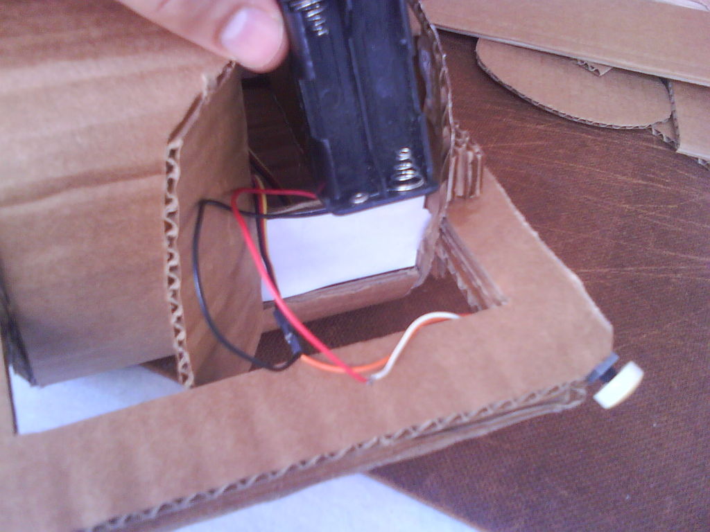 - 04齿轮的自行车后变速器齿轮(螺钉,内筒和两个瓶盖,每个); - 超过02螺丝的内筒; - 约75CM自行车链条(运行); - 床板木箱**我用3MM的轻木,因为他在家。也可以用厚纸板(0.5毫米),这是很容易找到。 - 车用齿轮,如图;或 - 标准伺服修改连续旋转(见互联网如何使这种变化); - 2衣架(伺服臂所示); - 2个小螺丝或胶水来粘住衣架。 - 支持四节电池 - 1常开开关 - 热胶,胶水,尺子,钢笔,铅笔等...