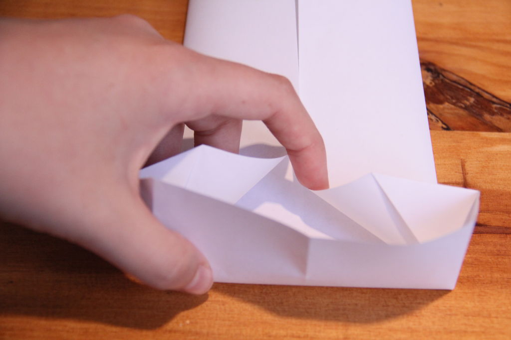 虽然仍捏三角形顶边向下折叠。它应该落入了...