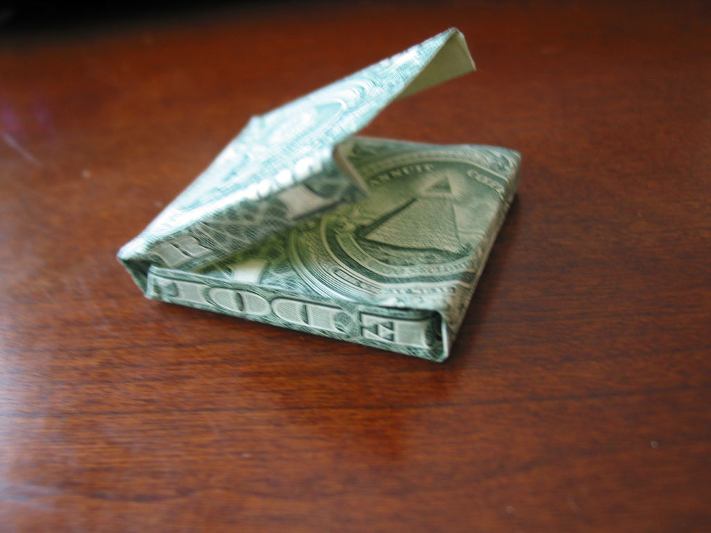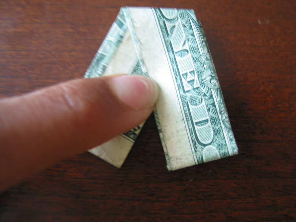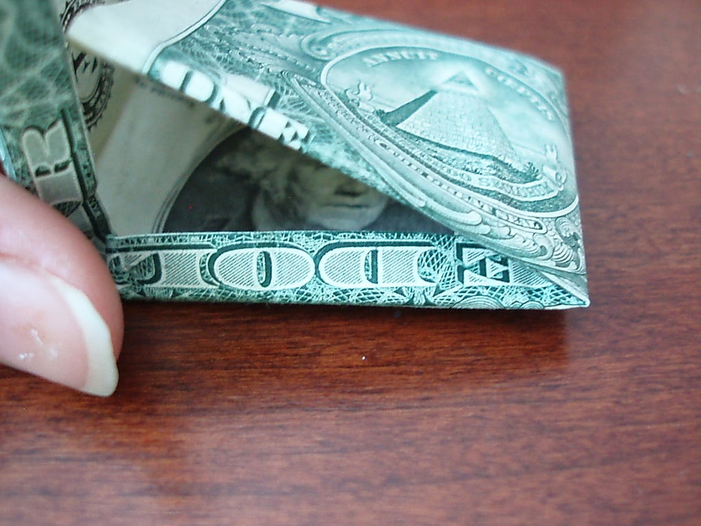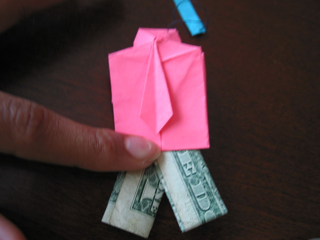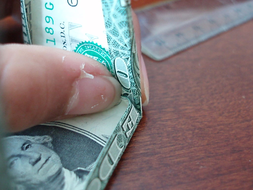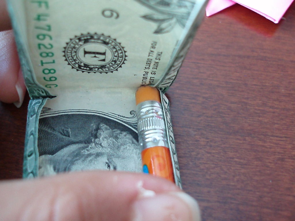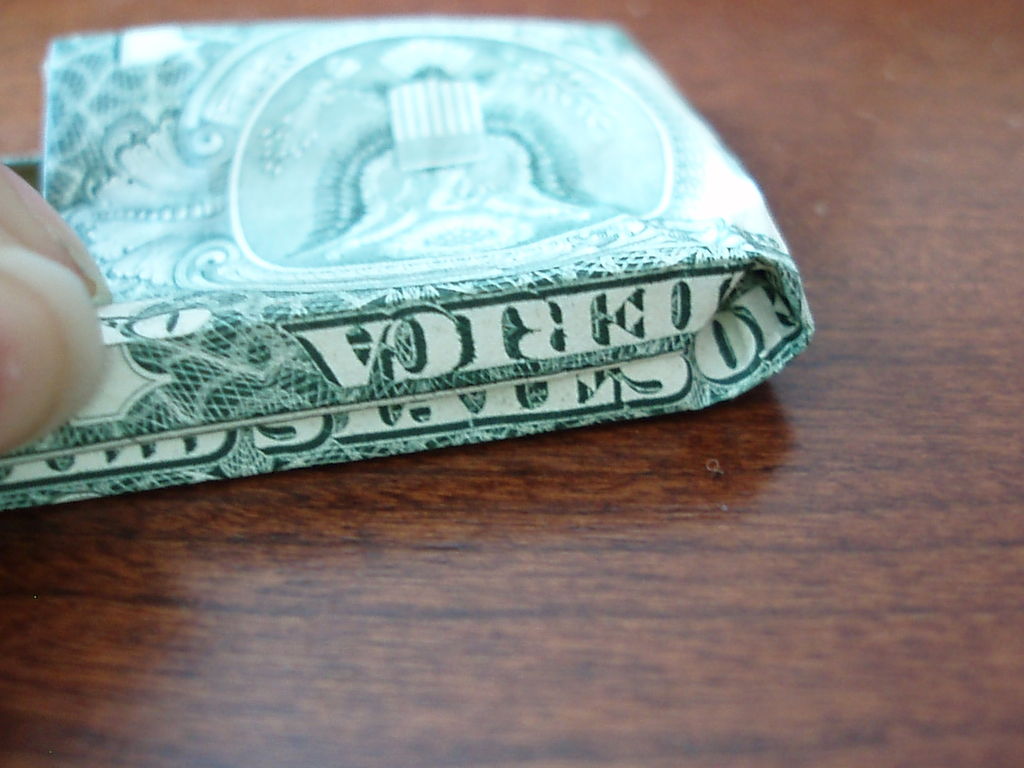 确保你开始正确的方向。你真的需要看到的图片为这一个。我把辛苦了!旁边,你需要小心的步骤,他们很难!折叠你的美元的一半汉堡包。展开。折叠左边距中,如图所示。折叠的顶部和底部边距再次折叠他们。可以肯定的顶部和底部边距很均匀,否则你的机器最终会渐行渐远。折叠的左侧直至华盛顿的边缘。虽然这样做,拉边出,形成所示的褶皱。折痕都记录下来。辛苦了!抠底挤掉了,而推顶边回来,和弄皱的角落。辛苦了!把你的铅笔,并在孔(第一橡皮擦端)滑动。反推小瓣东西(如图所示)和折痕周围的一切吧。我大惊小怪与此很长一段时间之前,我得到了它寻找恰到好处。确保你弄皱每件事情做好,给它最好的四四方方的形状。难难难!!!该是多张图片为这一个。滑动衬衫英寸的袖子不适合,所以后面的折叠他们。做一个精神记下衬衫的底端,并把它拿出来。折叠结束了在那个地方。就像你在步骤5中所做推入顶部边缘。此外,保持底边向上。使相同种类的角为5步。辛苦了!关闭对话框,折下来,你刚才提出的皮瓣,然后向下折叠的其他瓣和掖在边缘。完成了!太好了!