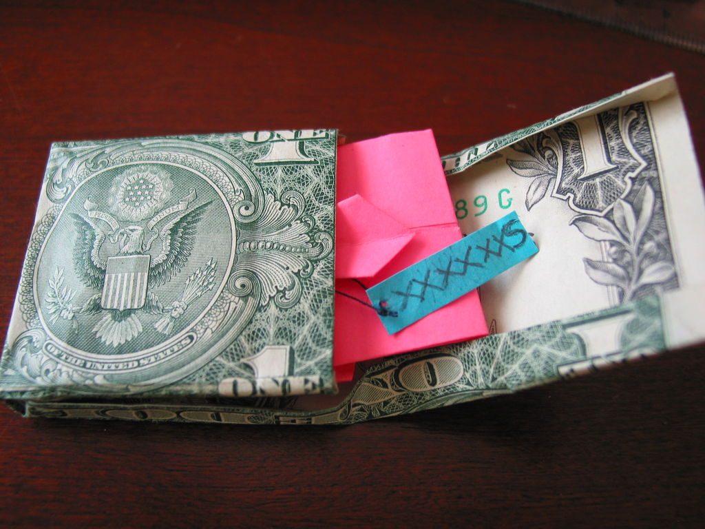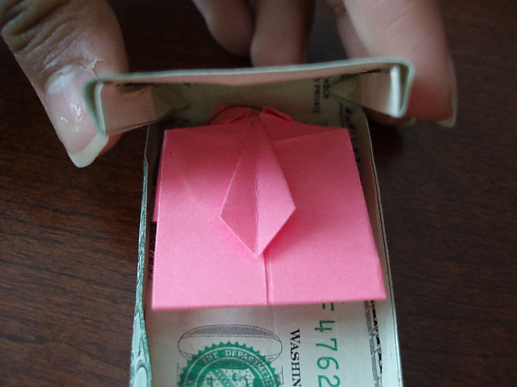 将衬衫与它的袖子箱折回。要打开,要么提起顶部瓣或滑出内襟翼和滑出的衬衫。您可以添加丝带,蝴蝶结等,或将其平原。我用的方块的指示说,你可以很容易地改变方块的形状,但我没有试过。你可以把不同的对象框,如果你改变了形状。如果你犯了一个美元的钞票戒指,你可以做一个很便宜的订婚戒指,完成一个匹配器。如果你想有一个完整的装备,还有折纸裤子。只是折一美元的钞票到四分之三长度,对折,再对折一个角度。当呈现当前,你会需要帮助他们打开它。只是不要打开他们。我用的方块的指示说的是iPod shuffle将完全适合于它。