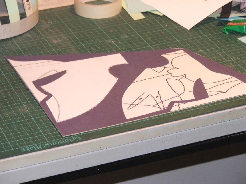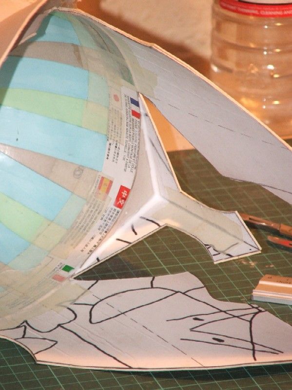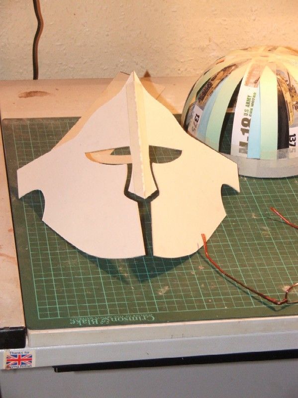 我搜索附近的网络寻找各种头盔的设计和模板。我决定,那些具有非常流畅的线条将是一个痛苦的沙子塑造。最后我去了几分混合设计是三个或四个图像和模板汞合金。我画了一个侧面模板上的一些废纸,然后只需通过追踪到另一张废纸。然后将这些切出,并使用一些喷雾装我粘他们一块废铁显卡我周围铺设。大错。我应该用麦片包板。显示卡是近1/8“厚很结实。然而,难以削减要求3遍用手术刀。一旦切出我粘和录音的联合顺着脸的中间。我选择使用“通过眼睛'方法的角度,做了一个小卡片圆角,以加强背部。现在第二个问题与节目卡。它不会弯曲干净!我不得不求助于它蒸过的水壶(有点危险),而且当时我在面板的下颌得到了一些涟漪 - 在今后的使用谷物卡.....一旦弯曲我暂时固定在适当位置用胶带,然后作出调整以得到我想要的契合。我做记号的地方最终会去,这样我以后可以重新定位。