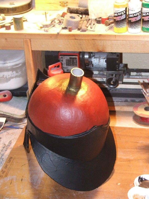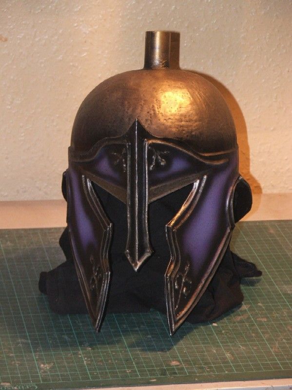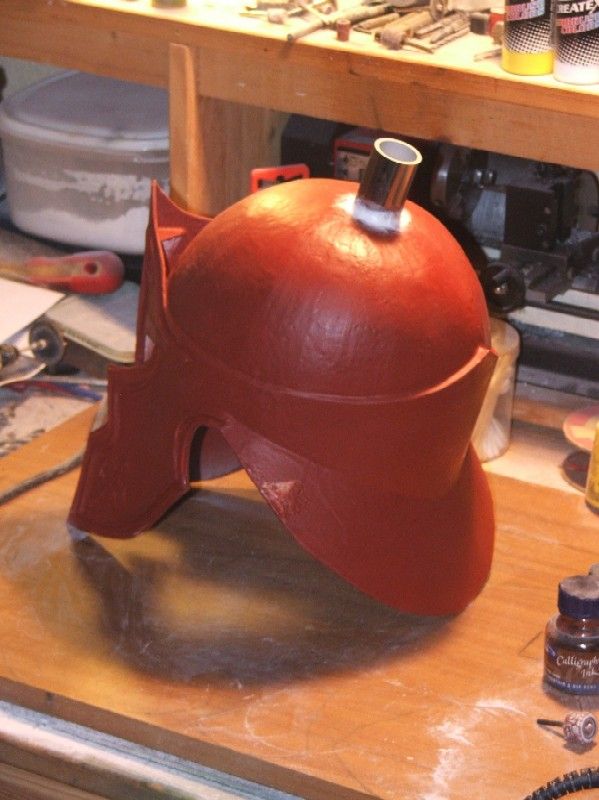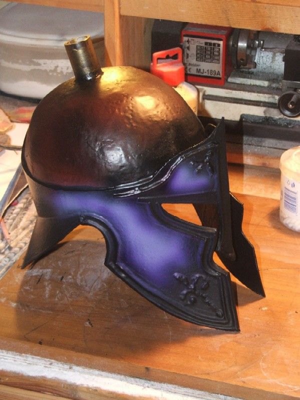 一旦头盔是在这个阶段,你可以决定添加一个波峰。我已经看到了使用旧的刷波峰很好的例子,但我想要一个马毛型的波峰。这是比较容易,因为马毛简单地安装到一块管在头盔上的拱顶。我开始用红色氧化物底漆总体外套,大多是密封的一切,而且还通过统一的颜色,你可以看到表面的铜锈。我决定,在圆顶的轻微的缺陷是跟上一个斯巴达头盔。我旁边粘PVC管的地方有两个部分的环氧树脂胶,离开它过夜干燥。我画的所有的下表面亚光黑用刷子。我周围涂用刷子波峰关节青铜领域,这将确保联合看起来自然更高版本。然后,我轻轻喷过的圆顶用黑色让红色显现出来。我加了颜色的使用紫色有点面板上的利益飞溅。接下来,我干磨砂的青铜覆盖的穹顶和带出脊的脸。然后,我干刷上的穹顶和银涂于面部小金。我继续在光通过这样做,直到我满意颜色的深浅。