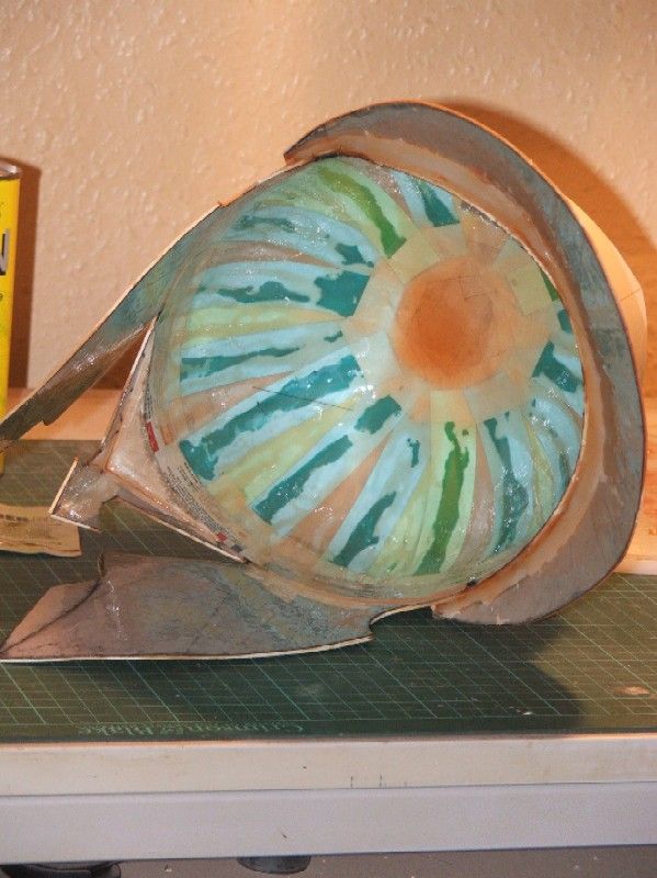 一旦主要建设工作已经完成,是时候开始强化,防水和装饰的头盔。首先给内表面的单个良好的衣树脂。让它完全固化。你可以看到杯子与之前的硬化剂混合树脂。我从来没有尝试使用超过半杯的时间,它治愈太快。还用非常便宜的刷你可以找到树脂的应用。一旦树脂套刷是没有用的。你可以尝试清除它们与丙酮,但这个东西是有毒的树脂所以要小心。该树脂会渗入卡的纤维,最终整个事情会变成一个超级强大的树脂的质量。有一个镜头固化内表面,你可以看到在树脂浸泡英寸接着给外层圆顶树脂的良好的单涂层,请勿树脂较低的外表面,只是还没有。接着,用一张纸,大致绘制出您想要使用的任何表面装饰。一旦你有你想要的设计,绘制出到你的卡面头盔使用铅笔。我加了一些卡眉脊和其中一些是管道使用'无钉'型胶华丽的设计。热熔应该很好的工作。接下来,我使用了一些金属丝热融化在表面添加了一些管道的工作。这最终串珠使用无钉胶和放置干燥。现在给的外表面树脂的良好的单涂层,并允许完全治愈。包括第二层上的圆顶。一旦固化打磨掉任何重大打点滴和颠簸。一切现在应该很好地密封在树脂中,整个事情应该是非常稳固。它也是现在防水。