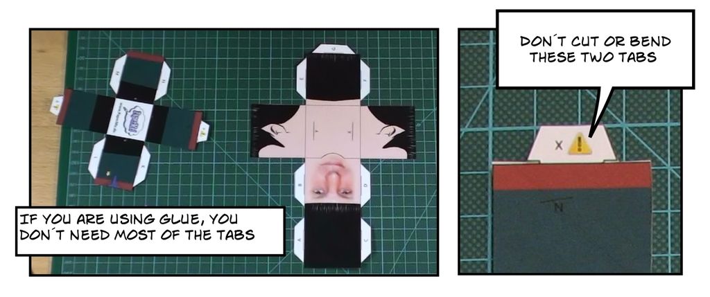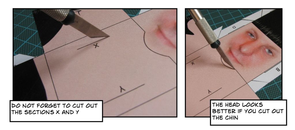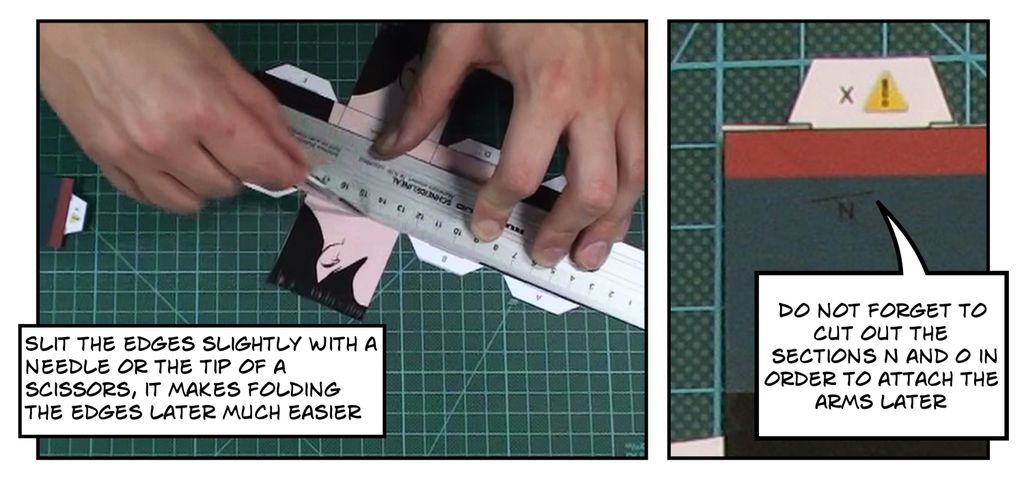 最佳的工具来组装你的纸工艺是:剪刀,尺子,胶水,刀具,针(非强制)和切割垫。如果您使用的是胶水(强烈推荐),你不最需要的标签。除去所有标签的两个带有警告标志的除外。重要提示:不要切断或弯曲的两个标签与警告标志。提示1:头部看起来更好,如果你切出的下巴。提示2:不要忘了切出的部分X和Y。它们被用于人体后连接。缝边稍微用剪刀一根针或尖,它使折叠的边缘后容易得多。不要忘了切出的部分N和O为了以后安装的武器。