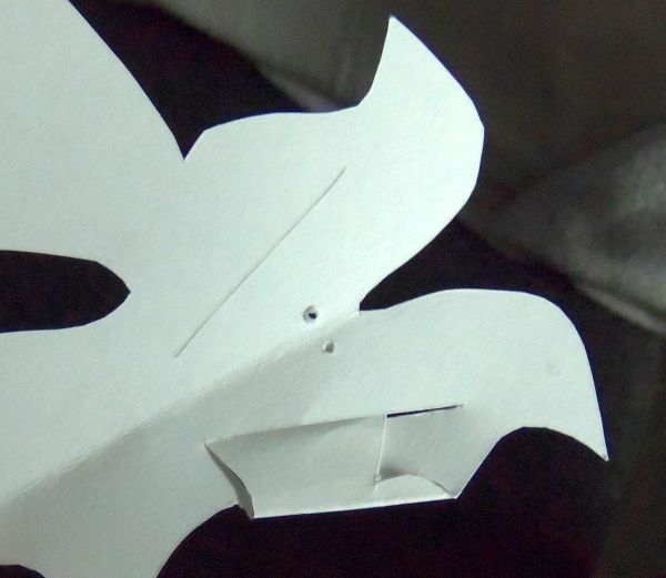 打印PDF文件到卡片纸。该Dove1.pdf是每片一个大格局和Dove3.pdf是每片3更小的图案剪下使用剪刀或美工刀在切割垫鸟。用美工刀切割缝上的鸟的身体的两条线。你可以使用一个小的打孔,使孔的两只眼睛或者只是让他们用黑色钢笔。这两个标记,靠近市中心都为衣架,我通常等待,使这个洞最后。折叠鸟半沿它的后面。