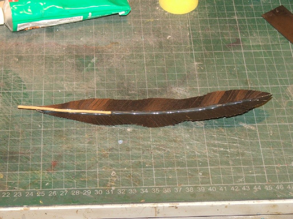 我在画板上,需要羽毛两三个项目。天色大黑飞羽。经过近一年的努力找到我所需要的,我需要的颜色和我想付出代价的大小 - 我准备放弃了。然后我的一个相当巧妙的美术老师的朋友,嘉莉霍伊尔,向我展示了一个基本的技术用于造纸的羽毛。我已经提炼她的技术稍微添加一些额外的鲁棒性和真实感。这种技术可适应做出各种羽毛类型,但它可以让你做羽毛高达约20“或40cms长的服装和道具。他们看起来相当有说服力的东西了约3英尺或1米以上的距离。