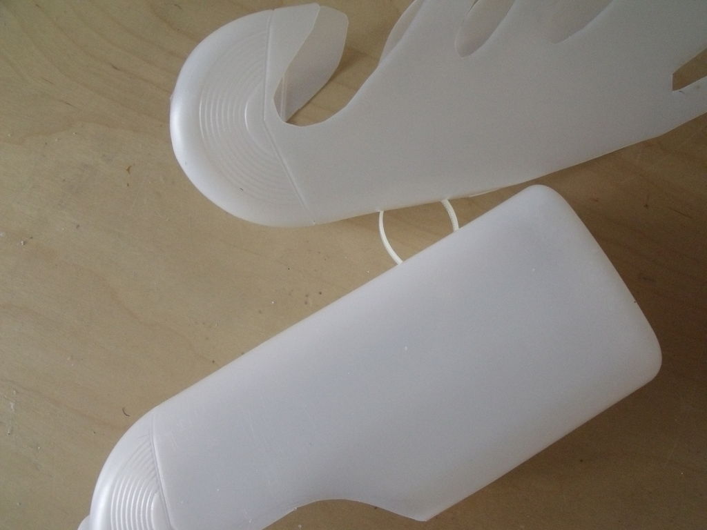 你的工具很简单:小钢锯,剪刀,锥子,可能是一把左轮手枪杆,毡尖pen.Your材料更简单:两个空塑料洗涤剂(洗碟)bottlesOne大的洗涤剂布特尔(衣服)2搭配wrapsAnd圣诞节的字符串灯(LED)从去年开始,将在另一个创造性地明年再用。我的是40个LED长