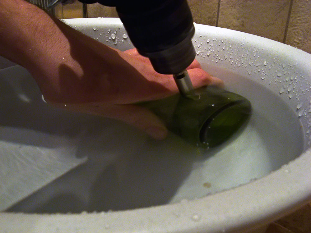 首先要记住,水电不混合,所以要小心,如果你有一个,使用气动工具。 1。保持你钻在一个安全的距离,并填补了一碗水。 2。把你的瓶子在碗里,水应该是有点高于瓶(0.1“是绰绰有余),这将是如果瓶子装满水更容易,所以它不会浮动。如果你不能找到一个合适的碗和使用自来水的方法,一定要放一块抹布下瓶子,让坚硬的表面(即砖)不划伤。 3。擦干你的手,如果他们是湿的。 4。就拿钻按住瓶用另一只手所以一切都平稳。 5。如果你钻有一个额外的手柄一侧,确保它依赖于你的正手,这样它更容易保持稳定,并开始在一个角度钻孔的地方约30度应该罚款。这将使起始槽。重要的是要保持钻头稳定在这一点上,所以有点不刮伤奶瓶。 6。最终理顺钻要垂直于瓶子。在演练中低转速,不要急于吧,耐心是你的朋友在这里。 7。后通过拍拍自己的肩膀钻。 8。洗瓶子,让它干燥。 9。从水渍清洁它的里面,让我知道你是怎么做的(认真,写的注释)。 10。把你的LED串里面穿过孔。 11。享受!