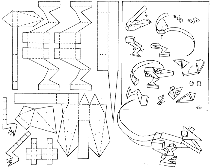 这是一种模式,我做了一个纸恐龙。对于其他机型和纸艺术,上看到Waljoris,Flickr后,Picasa网络相册和其他。模板有雕刻的优点在于,可以重复。线,艺术可以被复制,放大或缩小规模。这样切出套件的发明和装配也百思不得其解,甚至康乐数学的一种形式。工作方法:复制(并最终放大)光纸板在副本中心,或打印机。您也可以使用一个灯箱。所有需要削减实线,需要所有虚线折痕。切割完成切割磨砂与爱好刀或一把小剪刀。做一个沉闷的菜刀和金属尺平压压痕。首先切出折痕的所有部件。然后尝试组装模型“干”。只有这样,当你完全理解模型开始粘合。用牙签标签上涂上胶水。按镊子(重要)的连接。油漆,只要你喜欢。注意:这个模型的武器需要折叠镜像彼此!