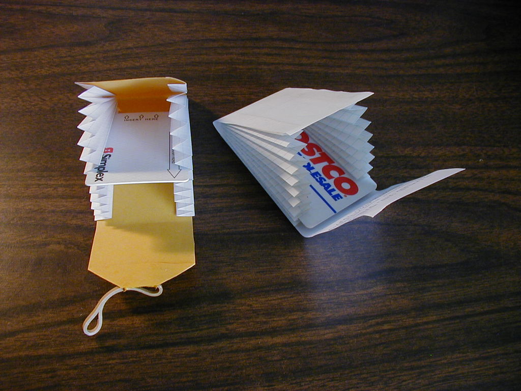 虽然冲浪的看到钱包挑战提到,我想我会给它一个镜头牢记任何钱包我买我自己的标准:最小的体积,减少深度的优先,加移动速度获得里面的物品。两个词:薄和快速。这里的钱包的设计提供了一个家,如果不是一切通常发现一个钱包,那么至少有更多的问题---卡。信用卡,会员卡,商务卡,等等。大部分的时间,我不希望这些东西挂在我的钱包,但我希望他们在我的书袋或汽车接近方便的情况下,我需要他们。 正如我在思考这个,我最终结算手风琴信封薄材料的手风琴,并在底部的制约,允许弯曲开放一次全部显示的内容---随机访问。这是一个常见的设计,如果手风琴材料是足够薄的,它保持相当薄的整体。 这里所用的材料(纸)被选定为便于操纵,但更多的强度或抗潮湿的东西可以很容易地使用,无论是对封面的内侧,或两者兼而有之。纺织品,金属,甚至是全景照片可以用于盖。内部最好保持薄,我用的纸可以很容易地获得一些水分从scotchguard阻力。关闭钱包也是敞开的改变。两个封闭的,但是许多是可能的,特别是与更强大的覆盖材料。 空卡钱包的最终厚度约0.5厘米,可容纳10-13卡。 (要投我一票,请打(+)加号按钮,在右侧页面顶部附近!)