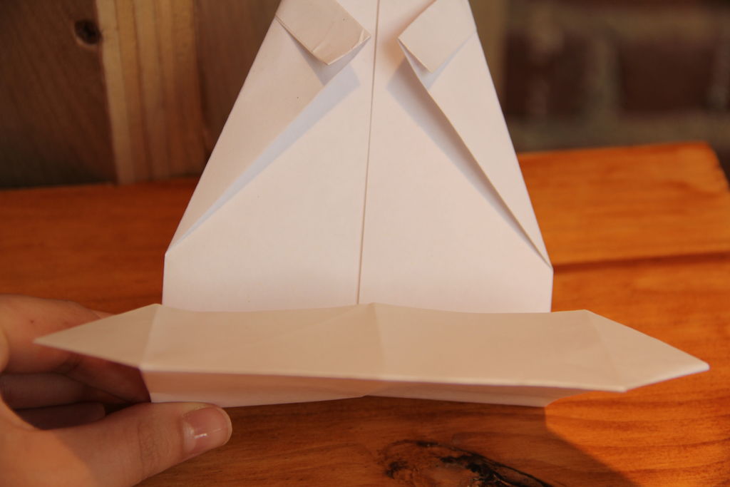 虽然仍捏三角形顶边向下折叠。它应该落入了...