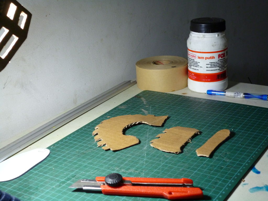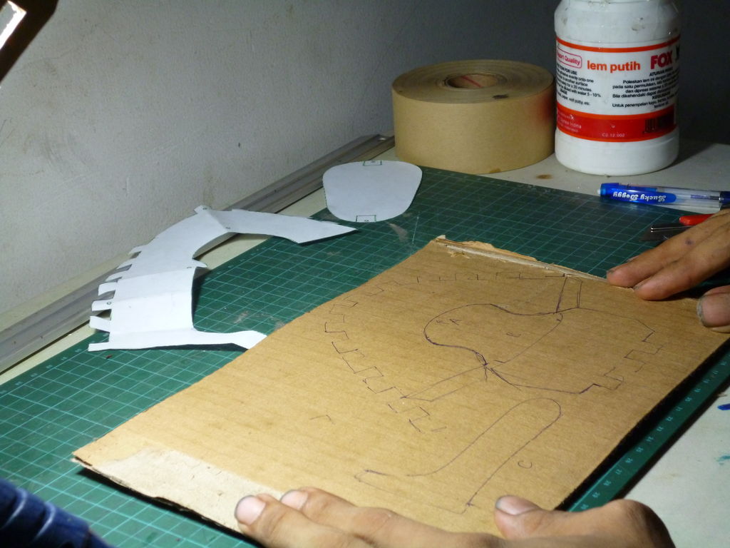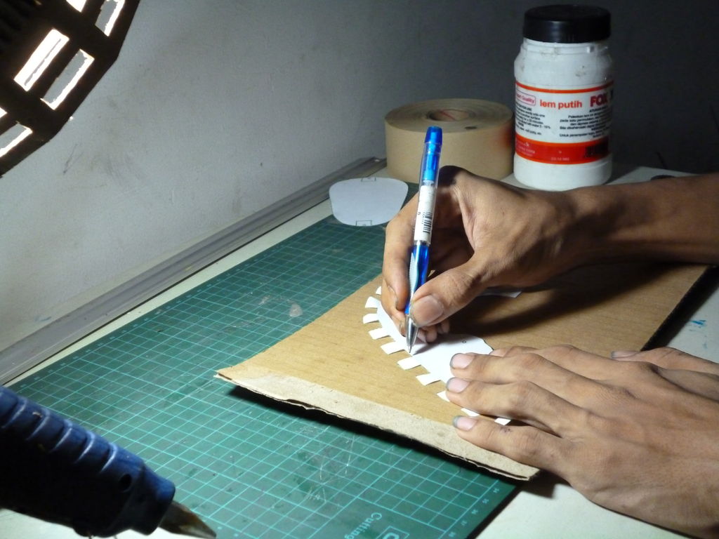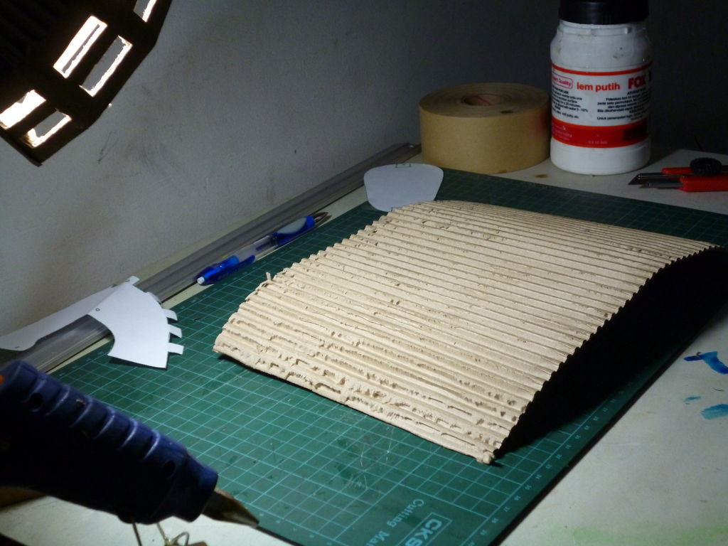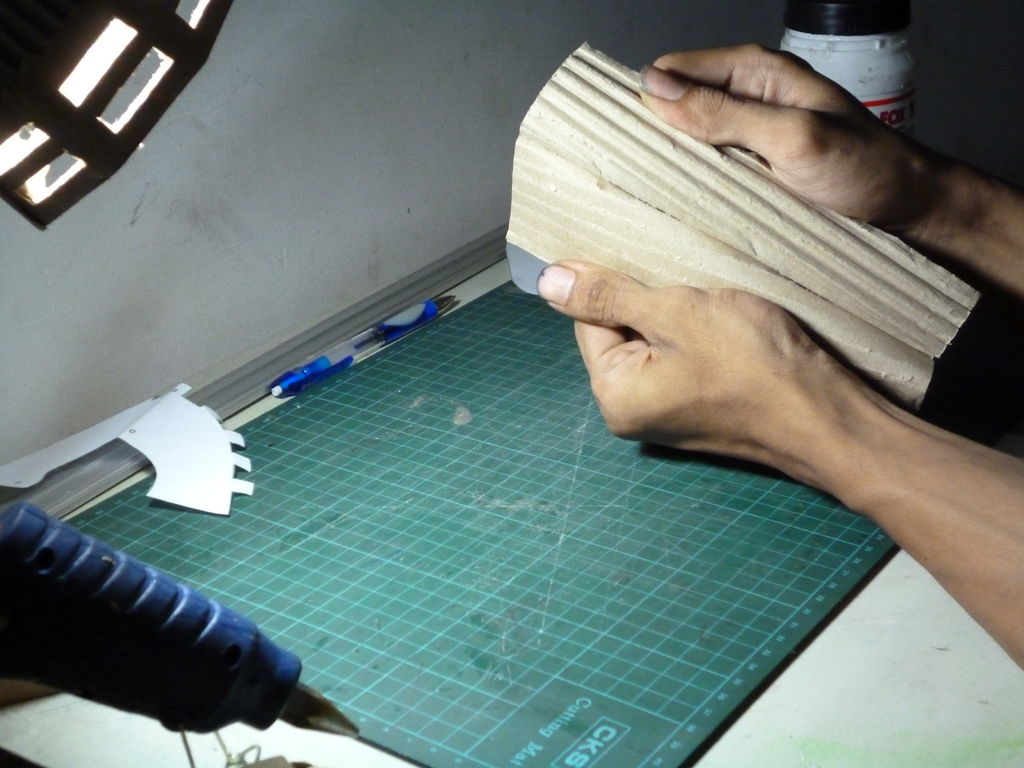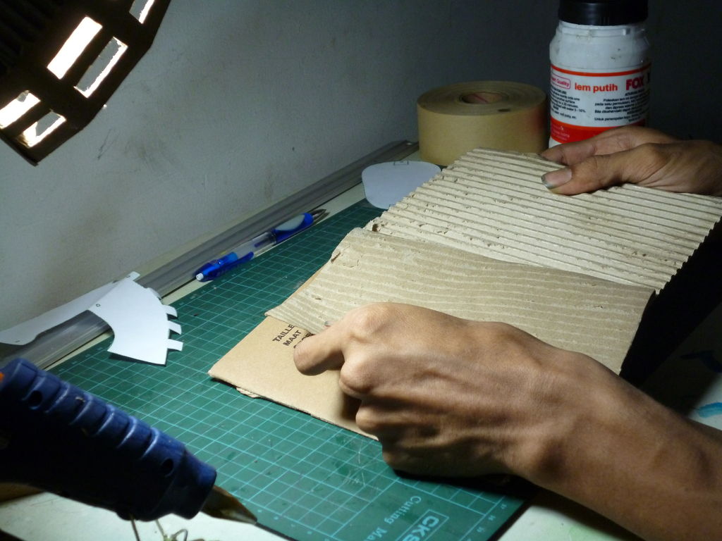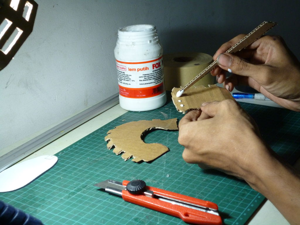 接下来,我安排纸板件,形成一个婴儿鞋,用热胶枪...