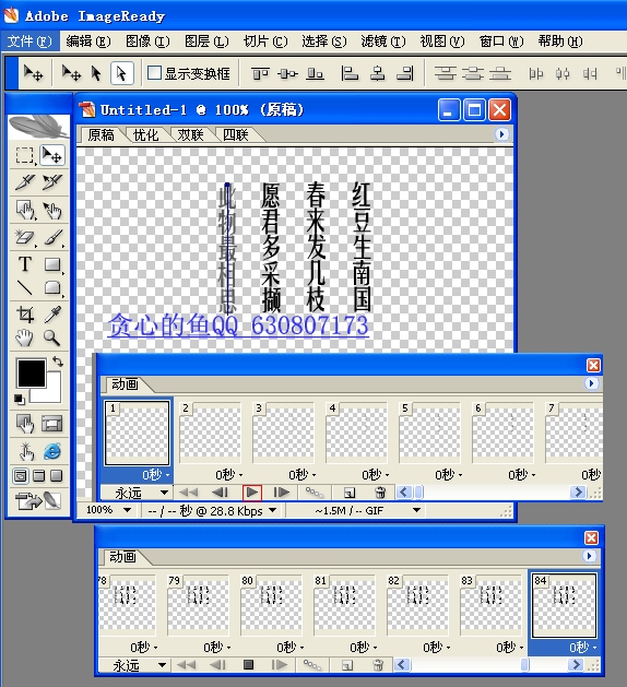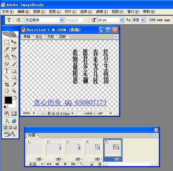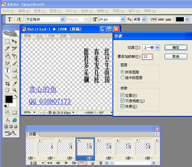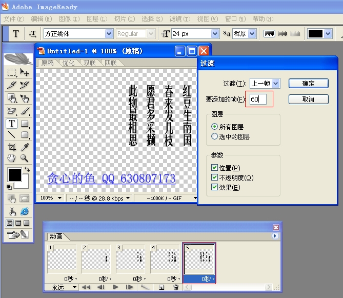 4 依照上面的做法每次复制一桢写上一句字体,直到写完如图: 5.最后选择第五帧 ,点过渡帧红色圈住区域调整帧数大小这里选择60如图: 6.依照上面把第四第三第二第一做过渡帧,(上面忘了说了就是红色圈住的那个图标就是过渡帧),帧数选择13 你也可以根据自己的需要改如图: 7.直到做完最后一桢,点击红色圈住区域播放看效果,最后就是保存,储存格式菜单栏文件将结果优化储存为GIF格式就可以调用了如图: